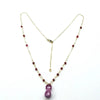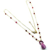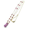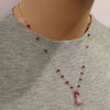 - Materials: 14 kt gold-filled sparkly cable chain and wire, candy jade drop (15x12 mm), 14 ruby color chalcedony roundels (3x4 mm), 7 fuchsia Swarovski crystals (3 mm)