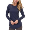 - Design Features: Scoop neck with rib binding, long sleeves, double needle hem, curved hem for flattering fit