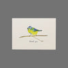 - Design: Features a hand-painted blue and yellow bird on a branch with “thank you” text