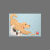 - Design: Two dogs playing with a tennis ball and bone on a paw print background