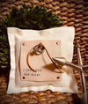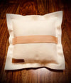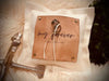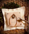 Designed to elevate your wedding ceremony, this exquisite ring bearer pillow is handcrafted in the USA from 100% American felted wool, embodying the finest in American-made bridal accessories. Measuring 9 inches square, this piece combines rustic charm with functional elegance, featuring a riveted 5-inch engraved American veg tan natural oiled leather patch on the front. This leather patch not only adds a distinctive artisanal touch but also cleverly conceals a hidden vow pocket beneath it, perfect for safeguarding your heartfelt promises. Finished with a natural leather strap on the back, this pillow is thoughtfully crafted for little hands to easily carry the rings down the aisle, adding a personal and timeless detail to your special day.