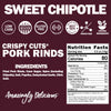 - Ingredients: Fried pork rinds, cane sugar, chipotle spice, salt, paprika, dehydrated garlic, citric acid