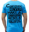 Forge your own path with The Original by Leber Apparel Line, a standout piece of American-made clothing proudly handcrafted in California. This vibrant blue V-neck T-shirt carries a bold message of defiance and individuality, featuring striking black Roman numerals "X" and "IV" on the shoulders and a distressed "NEVER CONFORM" emblem that embodies the spirit of rebellion. Meticulously printed in Chicago, this premium men’s tee blends patriotic style with premium craftsmanship, making it an ideal choice for those who value quality and self-expression in their wardrobe. The Original is more than just a T-shirt—it’s a statement, crafted in the USA to support local jobs and celebrate freedom.