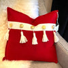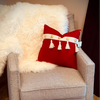 Celebrate vintage charm with a fresh holiday accent through this beautifully crafted Christmas tassels wool throw pillow, proudly made in the USA. Handmade in America with carefully sourced felted wool, this pillow adds a cozy, nostalgic vibe to your seasonal décor. Its rich red color, accented by a contrasting cream band adorned with elegant tassels and gold buttons, blends classic holiday cheer with modern design sensibilities. Measuring 17" square and finished with a refined flat piping edge, it pairs seamlessly with complementary pieces like the Christmas bow pillow to complete your festive living space. This throw pillow also makes a thoughtful and unique USA-made gift idea for those who appreciate quality craftsmanship and timeless holiday style.
