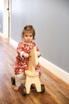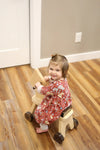 Crafted in the USA by skilled Amish artisans from Lancaster County, Pennsylvania, this wooden riding horse ride-on toy blends traditional craftsmanship with playful imagination. Handmade with care, this toddler ride-on encourages early motor skill development and imaginative play, inviting little ones to “walk” their horse around as they dream up adventures like roping cattle or riding a bucking bronco. Finished with a child-safe, non-toxic coating, this American-made toy offers a sturdy, smooth surface ideal for young riders. Its rolling wooden wheels provide seamless movement, making it a delightful companion for curious toddlers exploring balance and coordination.