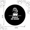 - Design: Classic black-and-white Beagle illustration with clear “BEAGLE ON BOARD” text