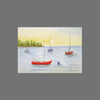 - Design: Watercolor artwork depicting sailboats on a calm lake with evergreen trees and a pastel yellow sky