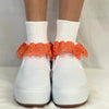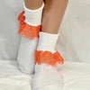 Whether you're dressing up for Halloween or showing off team pride at a tailgate, the BLOSSOM lace cuff socks offer a distinctive look that sets them apart from typical socks. The intricate lace trim adds a feminine and vintage-inspired edge, while the soft white base ensures comfort all day long. These socks are not just an accessory but a statement piece designed to enhance your outfit with a handcrafted touch.