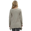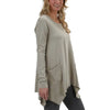 - Design Features: Ribbed scoop neck with V inset detail, patch pockets, long sleeves with double needle hem, asymmetrical hemline with overlock finish