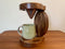 - Materials: Reclaimed walnut wood for the top and base, light-toned wood for the sculpted stem, stainless steel reusable cone filter