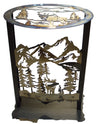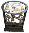 Immerse your home in the rustic charm of the American wilderness with this handcrafted elk and mountain metal art accent table, proudly made in the USA. Meticulously crafted in the USA from heat-treated steel, this striking piece features a layered silhouette of a majestic elk standing amidst towering pine trees and rugged mountain peaks. The intricate cut-out design brings depth and texture, while the artistic finish showcases captivating hues of bronze, gold, and hints of blue, mirroring the natural beauty of the outdoors. This American-made metal accent table effortlessly combines artistry with function, making it a standout addition to any cabin, lodge, or home decorated with western or mountain-inspired aesthetics.