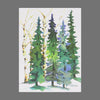 - Artwork style: Watercolor illustration of tall evergreen trees