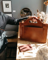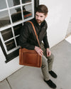 Designed to elevate your professional routine, the Franklin Satchel blends sharp, purposeful design with everyday practicality. Handmade in the USA, this American-made satchel is crafted with full-grain leather and finished with solid brass hardware to ensure longevity and timeless appeal. Its streamlined silhouette neatly accommodates laptops up to 15 inches, notebooks, and documents, making it an ideal choice for the modern professional who values both style and function. Two external pockets provide quick access to essentials, while the rich, natural leather takes on a unique character with each use—offering a distinctly personal accessory that deepens in beauty over time.