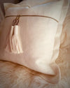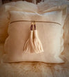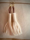 Embrace cozy sophistication with this white wool tassel throw pillow, handcrafted in the USA to elevate your living space. Made from premium American felted wool, this pillow offers a soft, textured surface that adds a warm, inviting touch to any room. The design showcases California-inspired aesthetics, featuring hand-crafted leather tassels that beautifully complement the exposed brass zipper, creating an elegant yet rustic accent piece. Filled with a plush American down insert, this throw pillow promises luxurious comfort and durability, making it the perfect addition to your sofa, armchair, or bed. Carefully crafted in the USA, this pillow combines artisanal quality with timeless design, ideal for those who appreciate authentic American-made home décor.