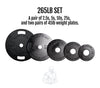 - 265lb set: Pair of 2.5, 5, 10, 25, and two pairs of 45 lb plates