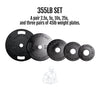- 355lb set: Pair of 2.5, 5, 10, 25, and three pairs of 45 lb plates