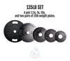 - 135lb set: Pair of 2.5, 5, 10, and two pairs of 25 lb plates