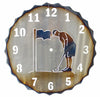 Showcasing a distinctive golf theme, this handcrafted metal wall clock is proudly made in the USA. Designed for those who appreciate both artistry and precision, this American-made clock marries function with a rustic outdoors vibe, making it ideal for golf enthusiasts looking to infuse personality into their space. With a striking silhouette of a golfer poised near the flag, the clock serves as a unique statement piece perfect for home interiors, game rooms, or covered patio areas alike. Crafted and finished meticulously in the USA, it offers durability and timeless appeal, blending practical timekeeping with an artistic tribute to the sport.