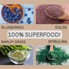 - Ingredients: Organic dried blueberry powder, organic barley grass juice powder, organic spirulina, organic dulse seaweed