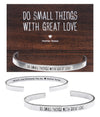 Embrace a daily mantra of kindness and intention with this American-made Do Small Things With Great Love Quotable Cuff Bracelet, handcrafted in the USA from recycled, lead-free pewter. Inspired by the timeless wisdom of Mother Teresa, this open cuff bracelet serves not only as a charming accessory but as a tangible inspiration to infuse each small act with great love and compassion. The quote "Do Small Things With Great Love" is elegantly stamped on the outside, while the inner band carries the heartfelt reminder: "Spread Love Wherever You Go – Mother Teresa." Designed by Whitney Howard Designs, this piece blends minimalist style with meaningful messaging, making it more than jewelry—it's a daily companion to motivate purposeful living and positive impact.