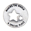 Distinctively designed to honor cherished family bonds, this Grandparents Blessing Ring Charm is handcrafted in the USA from recycled, lead-free pewter. This American-made charm, roughly the size of a quarter, beautifully balances meaningful symbolism with everyday versatility. Featuring two stars at its center and an uplifting engraved message, it reads “Grandparent Blessing Ring” on one side and “Making the World a Special Place” on the other, conveying heartfelt appreciation for grandparents' vital role in our lives. Perfectly suited for your pocket, keychain, or necklace, this charm serves as a tangible reminder of love and gratitude, blending meaningful craftsmanship with emotional resonance. It’s an ideal keepsake to gift on special occasions or a personal token to reflect the timeless impact grandparents have on family.