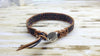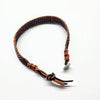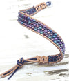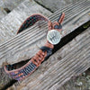 Discover the rugged elegance of this extra-large men's leather bracelet, meticulously handcrafted in the USA for those with bigger wrists. Handmade in Montana by artisan Alexa Martha, this bracelet showcases intricate needle and thread loom weaving featuring earthy beads in pine green, grey, black, brown-purple, and solid copper tube accents. Designed to embody strength and style, the three-row beadwork is complemented by light brown macramé leather sections and finished with a distinctive Tree of Life button closure, symbolizing growth and resilience. This American-made men's accessory perfectly blends rustic charm with refined craftsmanship, making it an exceptional addition to any masculine jewelry collection.